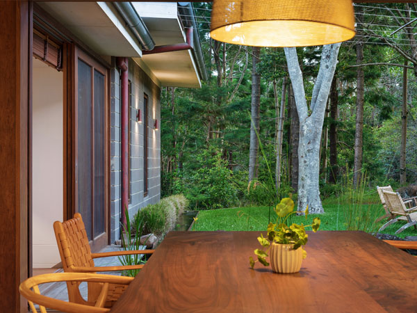 A concrete bathtub overlooks the rainforest reserve accompaning an oversized wood-floored shower. Steam away your cares in the evening. Indulge in a hot bath after a swim – gaze out on the rainforest, or be transfixed by the old-growth hoop pines, wallabies and bird-life.